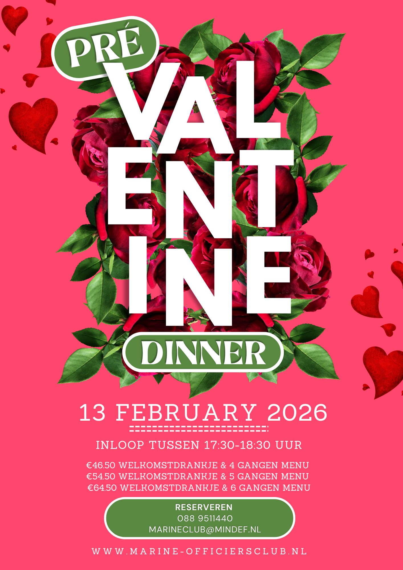 Bent u niet in de gelegenheid om uw Valentijn te verrassen op 14 februari, dan bieden wij u een mooi alternatief " Het Pré Valentijnsdiner op vrijdag 13 februari" !